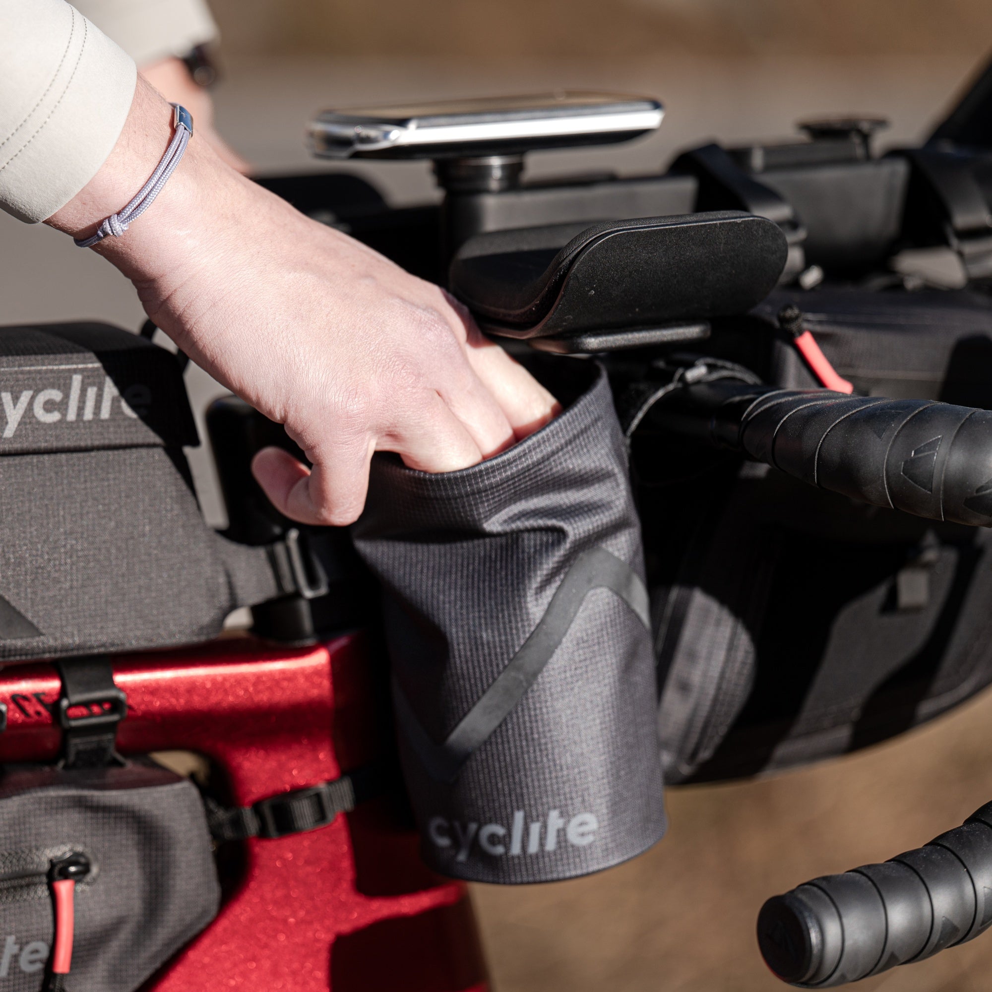 Die Cyclite Food Pouch ist eine funktional gestaltete Lenkertasche in schwarz, die speziell für den schnellen Zugriff während der Fahrt entwickelt wurde.