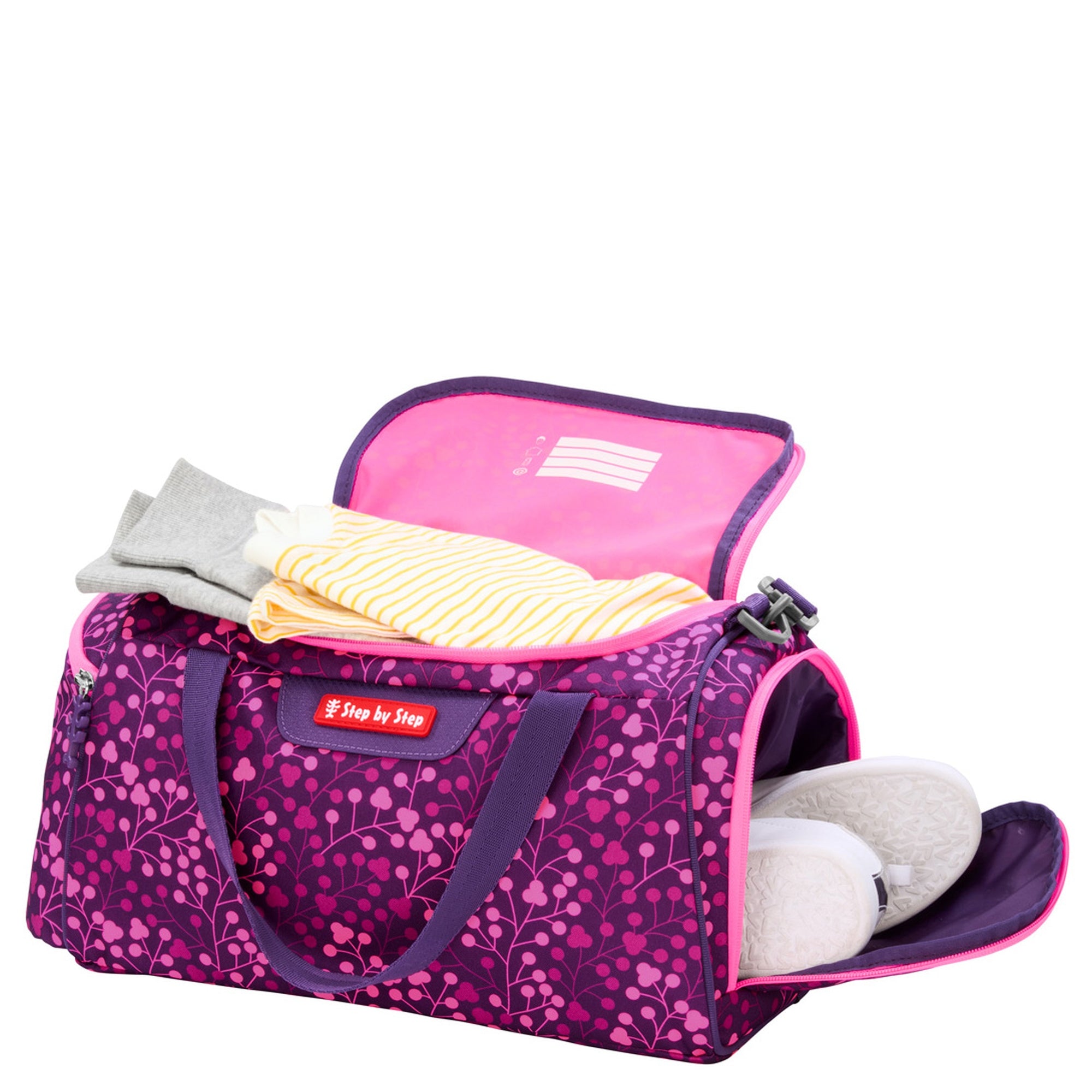 Eine praktische Sporttasche von Step by Step, die mit ihrem farbenfrohen Design und durchdachten Details überzeugt. Ideal für den Schul- und Freizeitbereich, bietet sie viel Platz für Kleidung, Schuhe und weitere Sportutensilien.