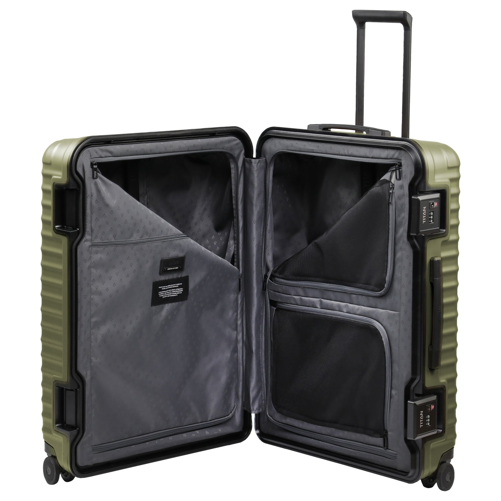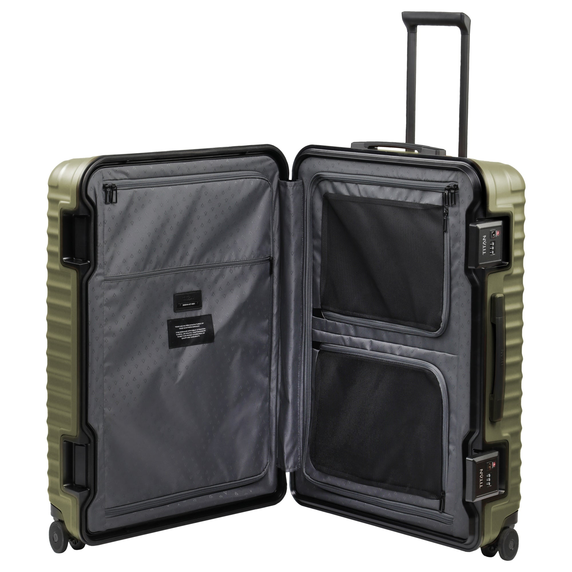 Ein robuster 4-Rollen-Trolley von TITAN, der mit seiner Polycarbonat-Hülle und einer speziell matten Oberfläche besonders kratzresistent ist. In der Farbe forest green bietet der OVERSEAS L mit 101 Litern Volumen ausreichend Platz für längere Reisen.