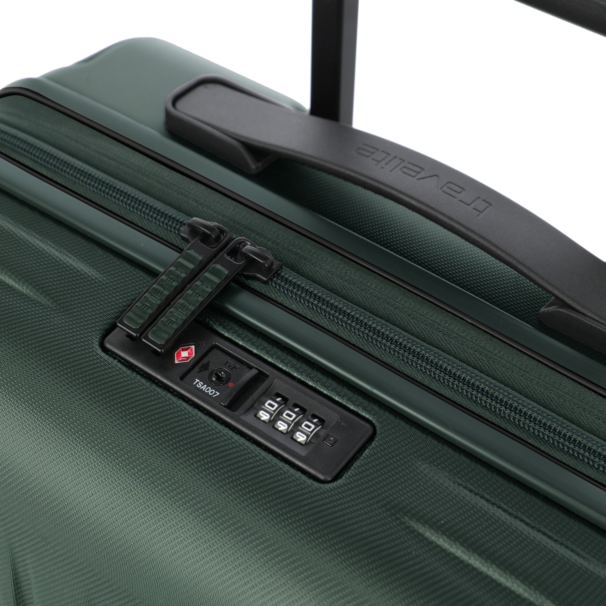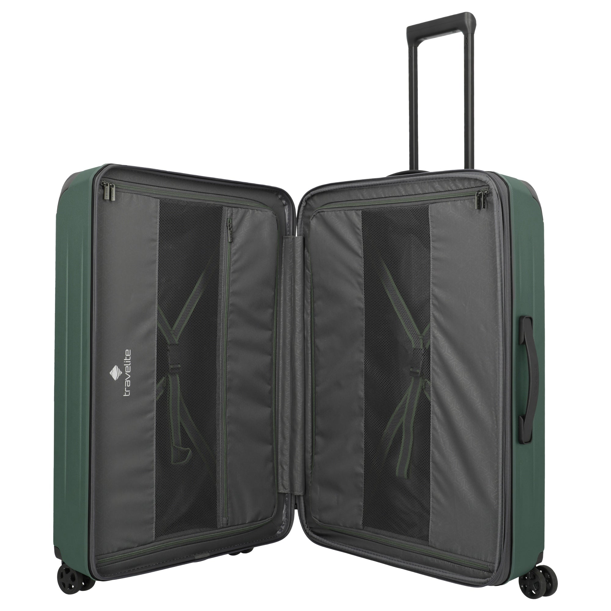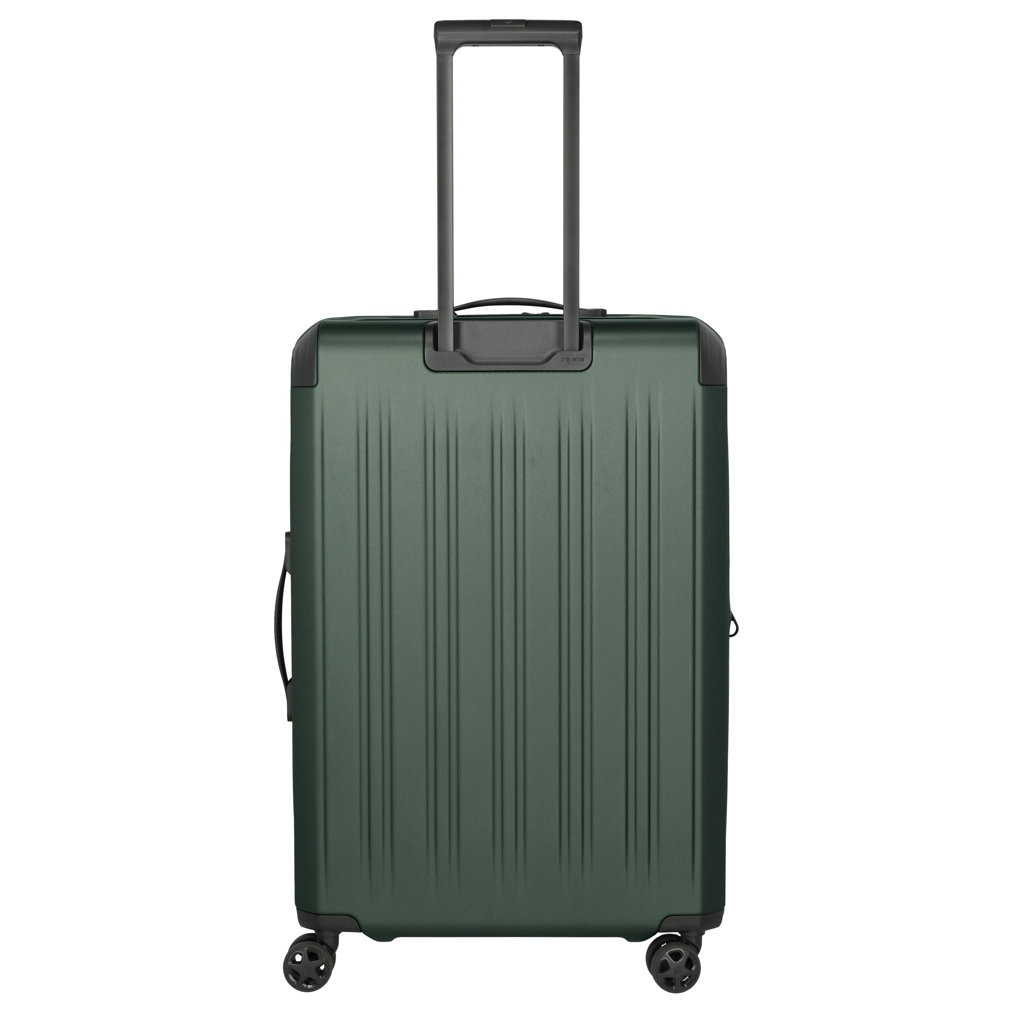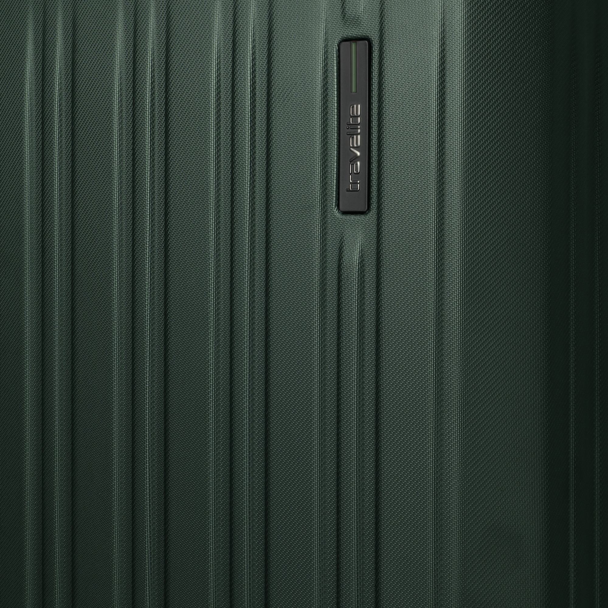Ein robuster und funktionaler 4-Rollen-Trolley von Travelite in elegantem Grün, der auf Vielseitigkeit und Schutz beim Reisen ausgelegt ist.