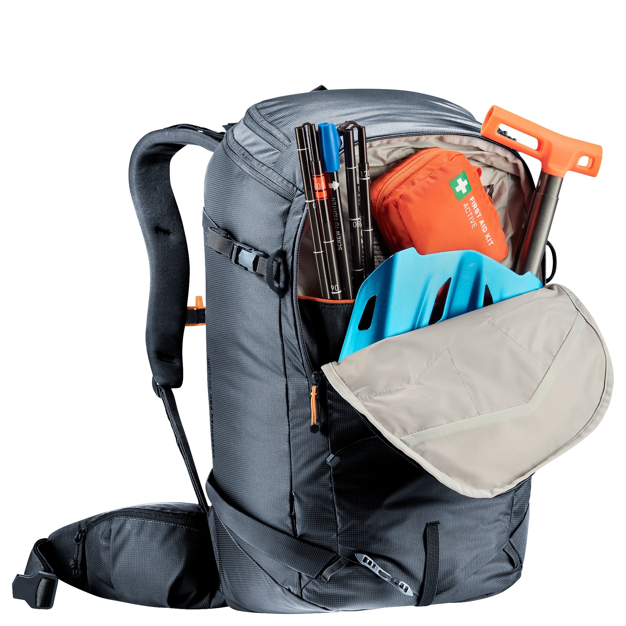 - separates Fach für Lawinensicherheitsausrüstung mit schnellem Zugriff im Notfall