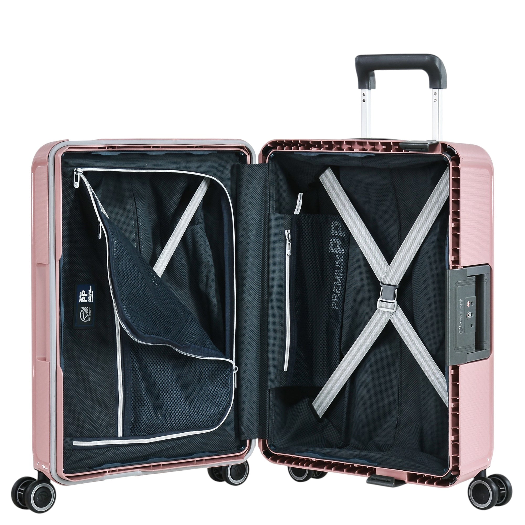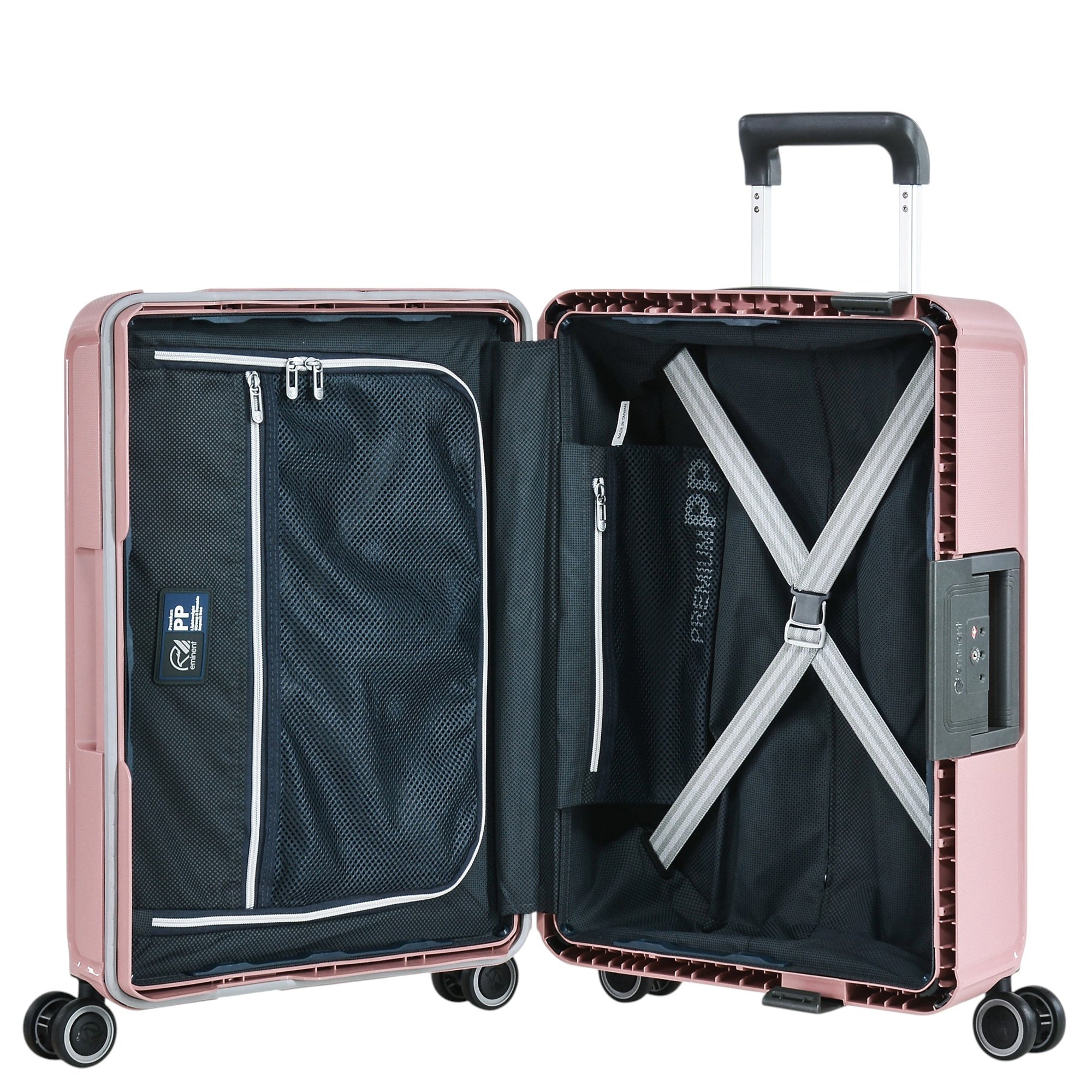 Der Eminent VERTICA 4-Rollen-Kabinentrolley in rosa ist ein widerstandsfähiger Begleiter für jede Reise. Hergestellt aus 100% Polypropylen, überzeugt dieser Hartschalenkoffer durch seine robuste, kratzfeste Oberfläche und sein durchdachtes Design.