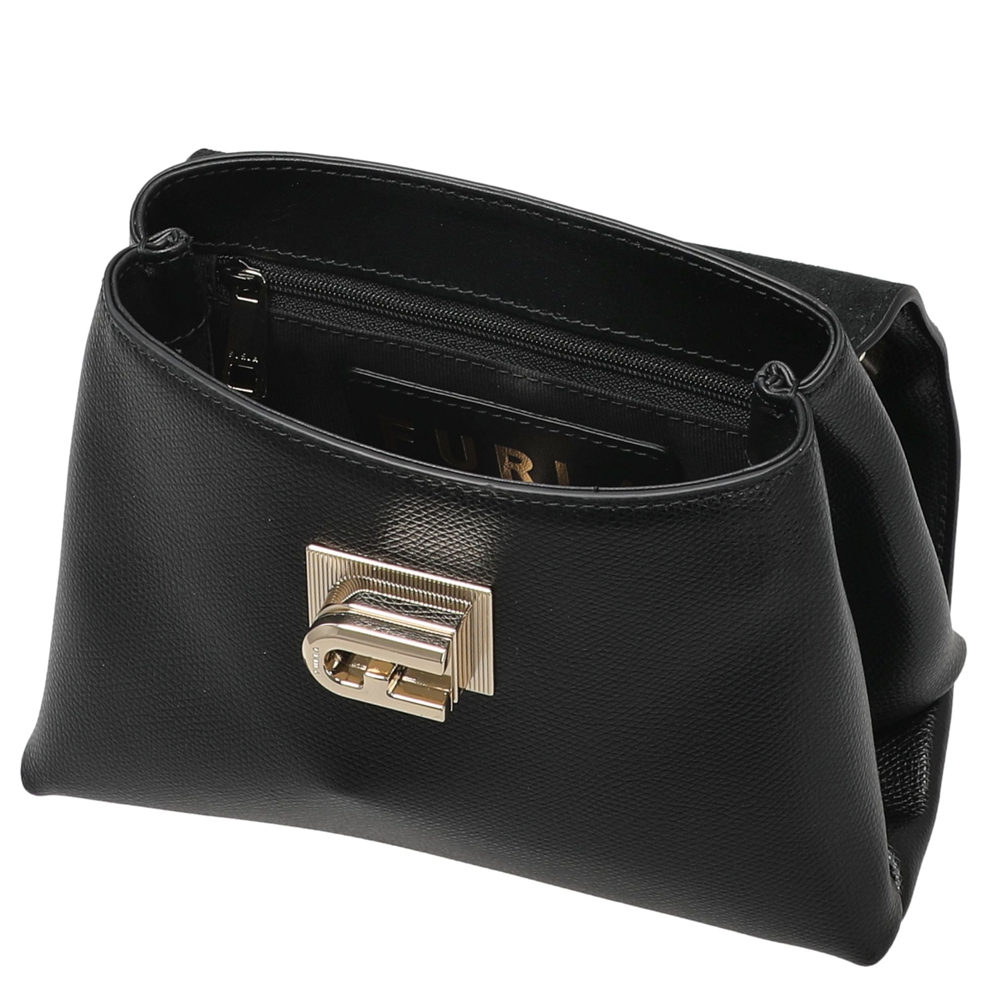 Die Furla 1927 Mini Umhängetasche in elegantem Nero vereint zeitlose Eleganz mit durchdachter Funktionalität. Gefertigt aus hochwertigem, leicht genarbtem Leder, überzeugt sie mit einem stilvollen Design und einem markanten Drehverschluss, der mit der ikonischen Furla Arch-Logo-Prägung ein echtes Statement setzt.