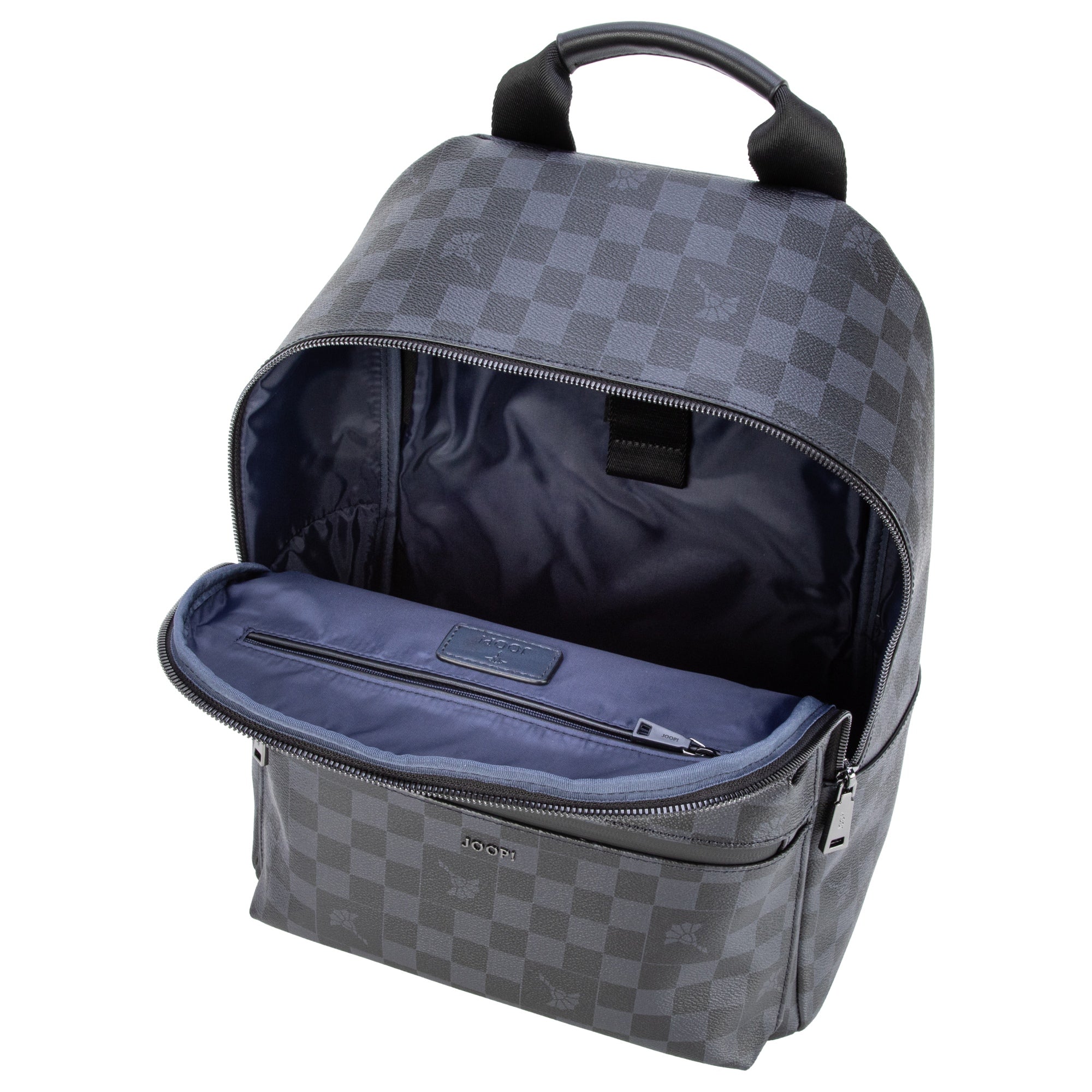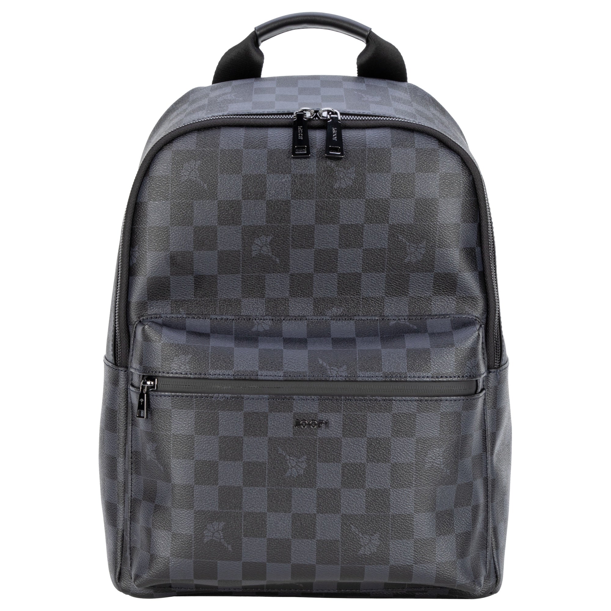 Ein moderner City-Rucksack von JOOP!, der durch sein edles Schachbrett-Allover-Muster in Schwarz stilvolle Akzente setzt und sich ideal für Alltag und Kurztrips eignet.