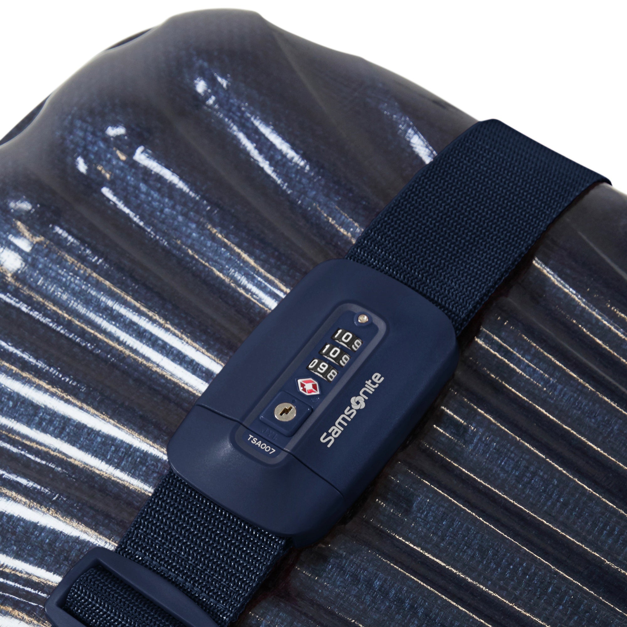 Ein robuster Koffergurt von Samsonite in elegantem midnight blue, der auf Reisen für mehr Sicherheit und Komfort sorgt.