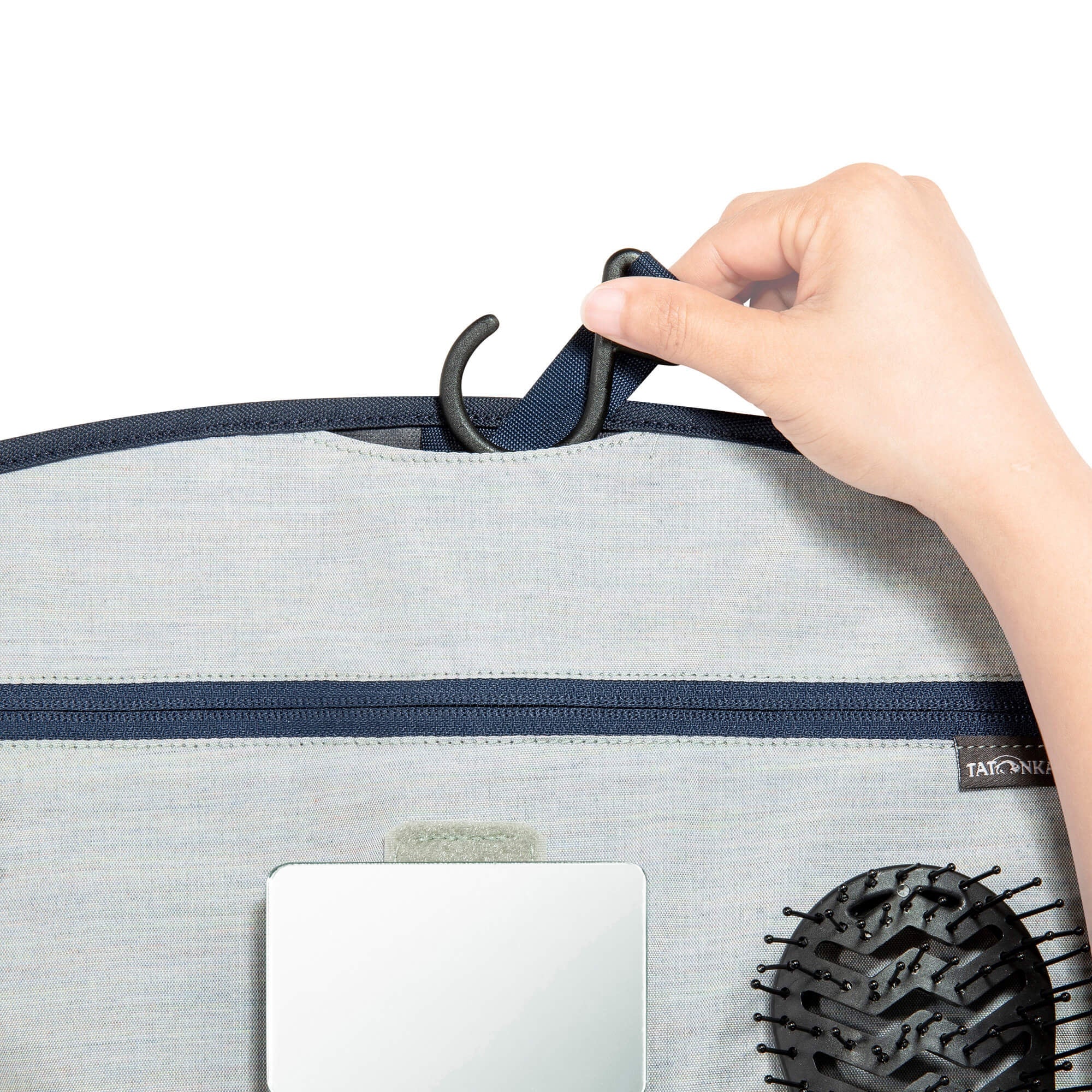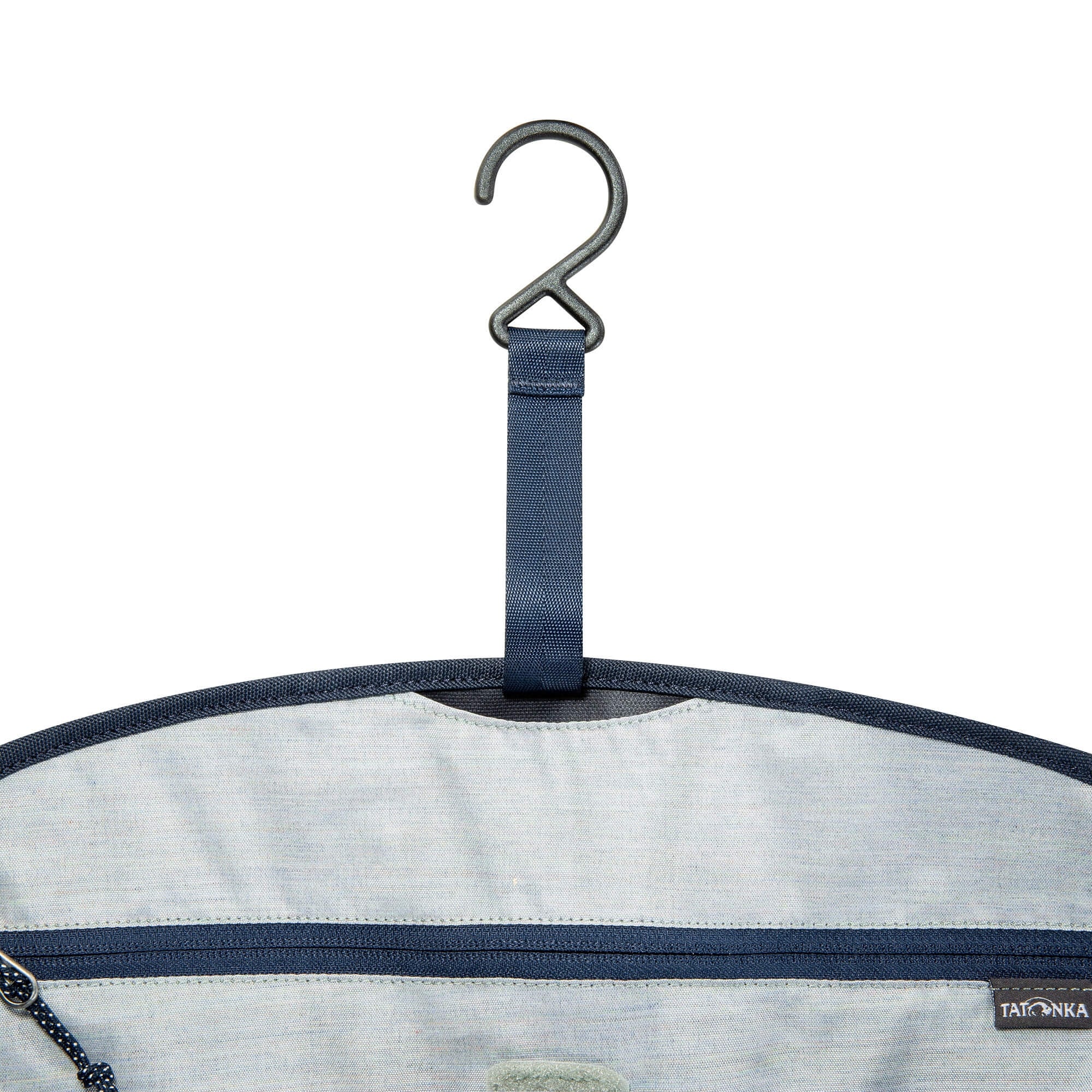 - Verstaubarer Aufhängehaken und verstellbarer Gurtbandverschluss mit Schließe für flexible Befestigung
