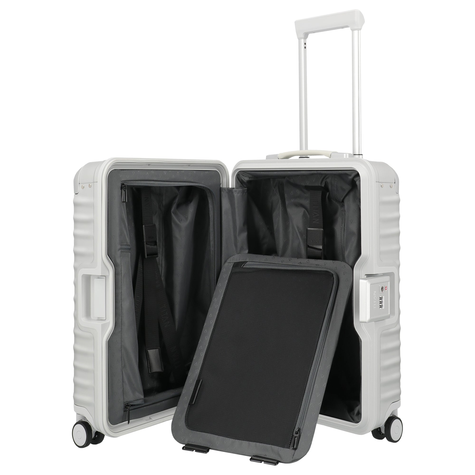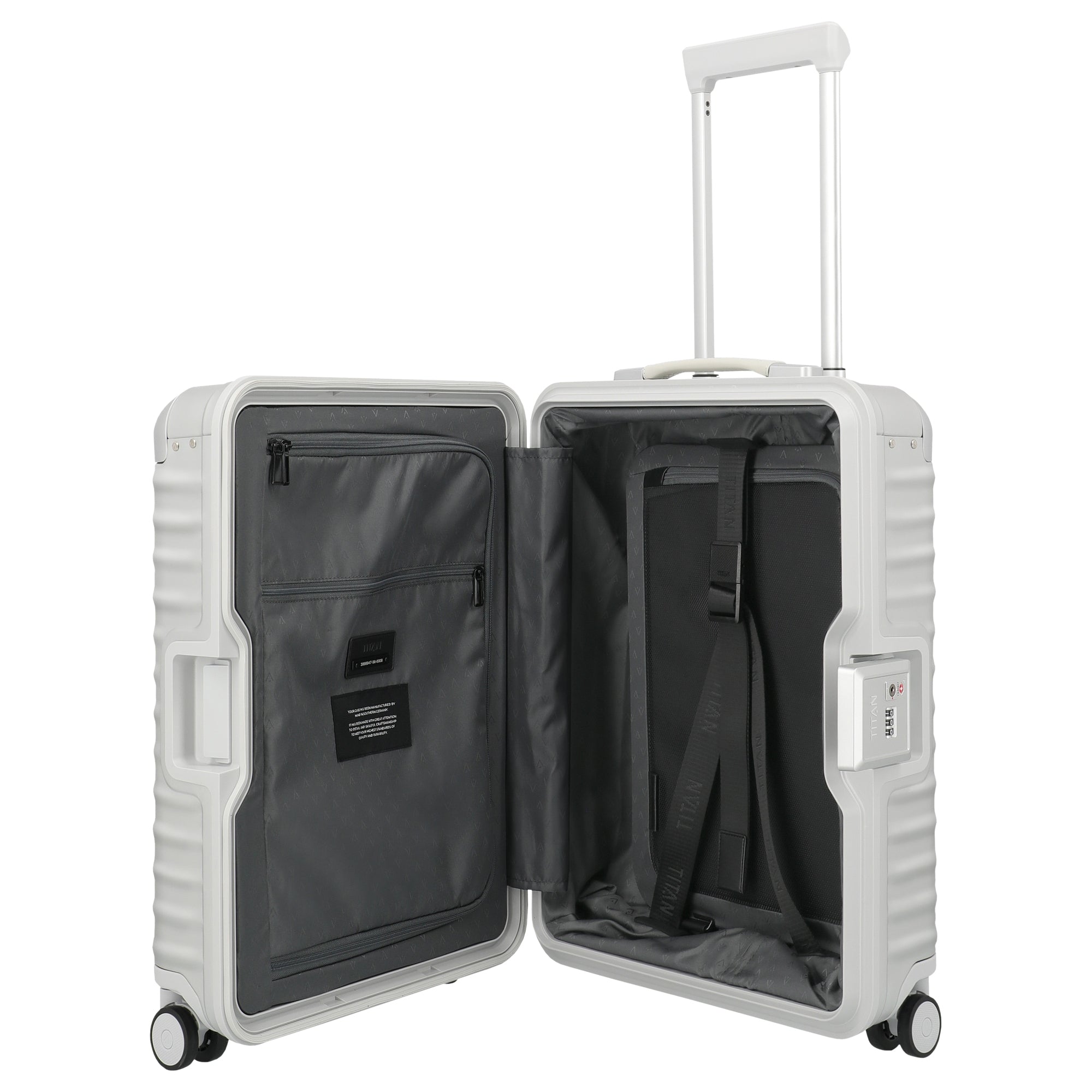 Der TITAN ETERNITY 4-Rollen-Kabinentrolley in Silber besticht durch seine robuste und innovative Bauweise, die auf Vielreisende zugeschnitten ist. Mit einer Höhe von 55 cm bietet dieser Koffer eine ideale Größe für das Handgepäck und kombiniert Funktionalität mit langlebigen Materialien.