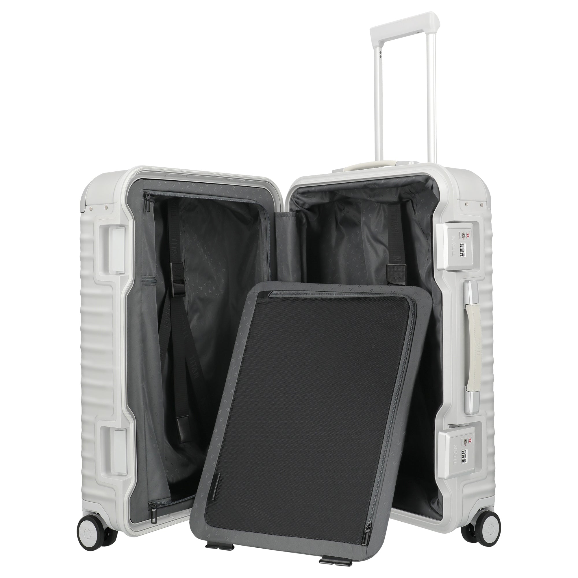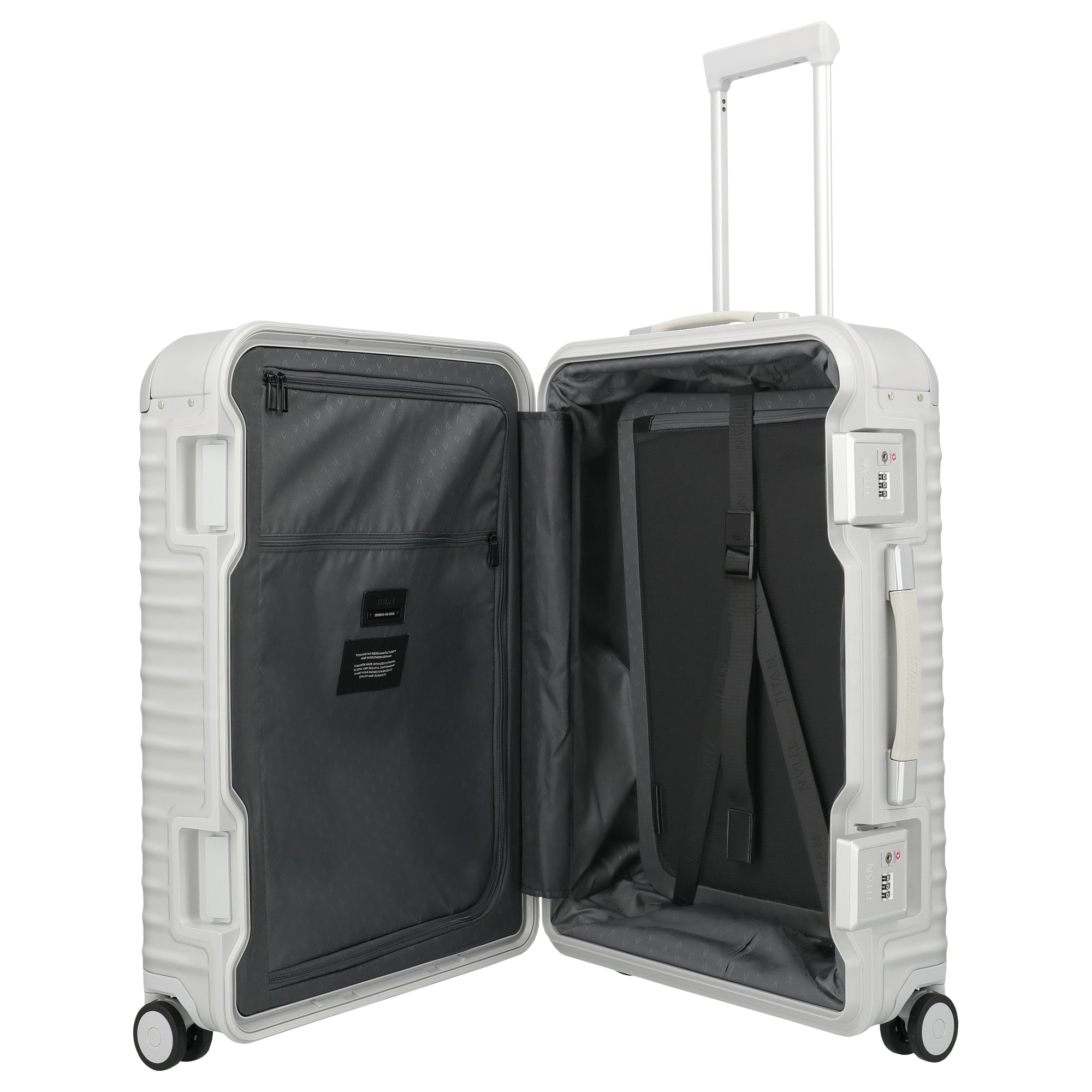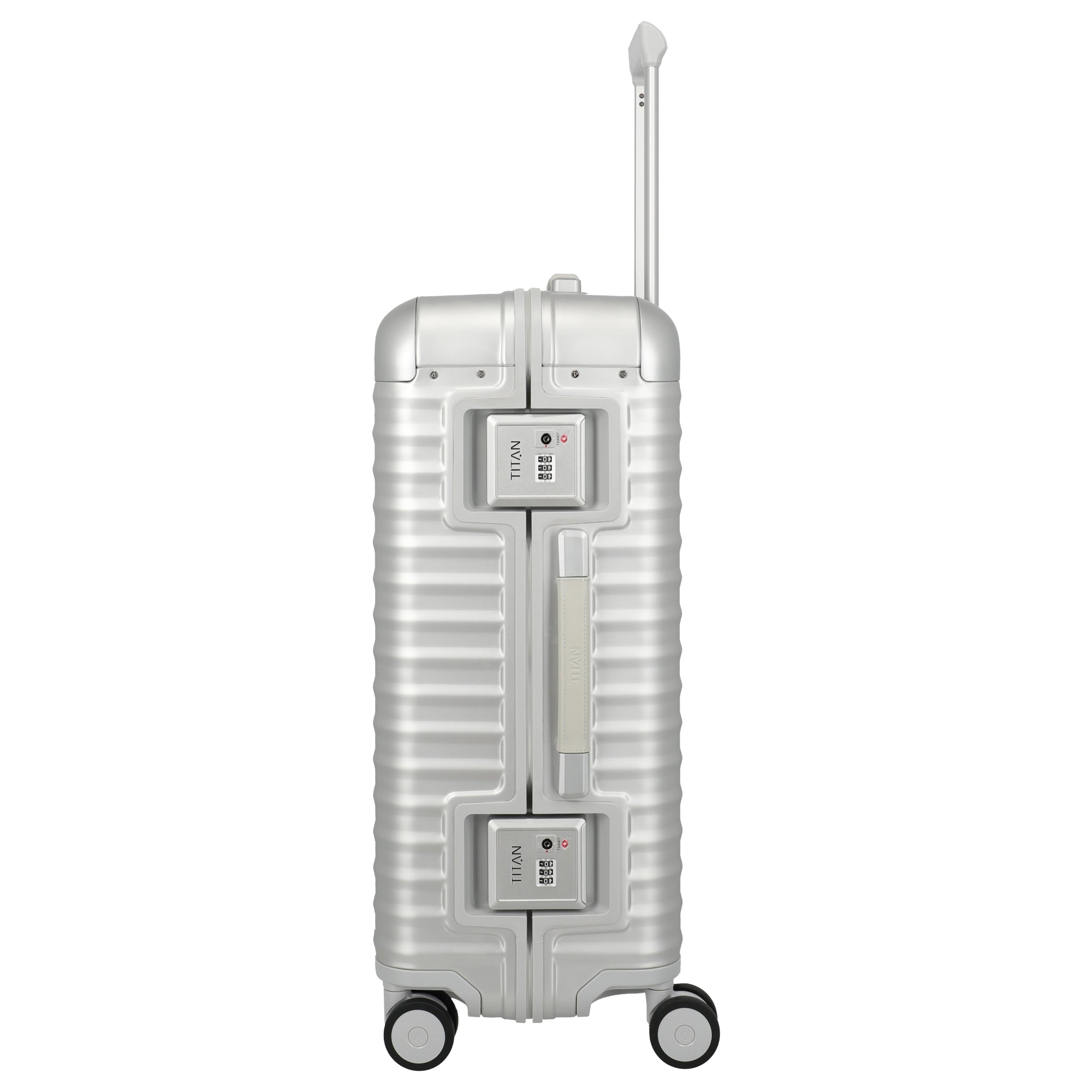 Der TITAN ETERNITY 4-Rollen-Trolley in Silber ist ein technisch durchdachter Koffer, der mit robustem Aluminium und einem innovativen Kunststoffrahmen für hohe Belastbarkeit überzeugt.